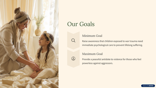 Unser Minimalziel ist es dafür zu sensibilisieren, dass Kinder, die traumatischen Kriegserlebnissen ausgesetzt sind, sofort psychologische Betreuung benötigen, da sie ansonsten lebenslänglich und im hohen Alter nochmal besonders intensiv ihre Traumata immer wieder durchleben müssen.