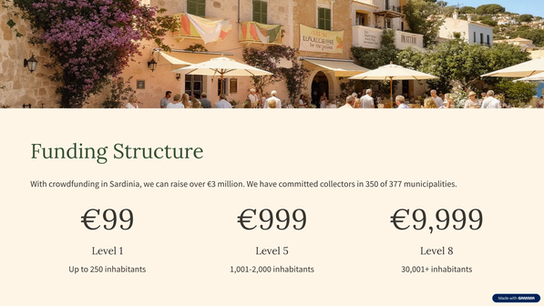 Mit einem Crowdfunding auf der italienischen Insel Sardinien kann ein Bruttobudget von über 3 Millionen € eingespielt werden. Zur Umsetzung des Crowdfunding können wir mittlerweile auf engagierte Sammler und Sammlerinnen in 350 der 377 Kommunen zurückgreifen.