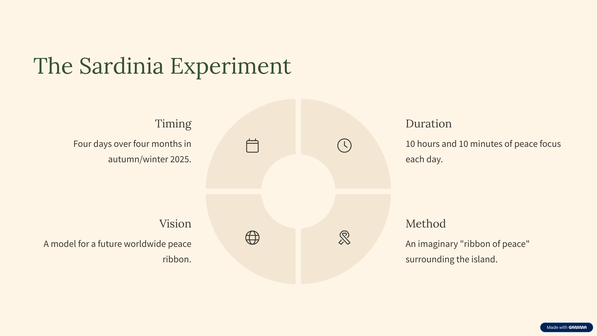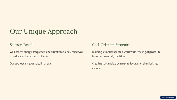 Zeitgleich bauen wir eine zielführende Struktur auf, die es ermöglicht das ein weltweites "Frieden fühlen" für einen Großteil der Menschheit zur monatlich wiederkehrenden Tradition werden kann.