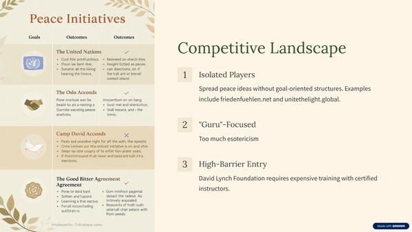 Oder andere Wettbewerber setzen die Eingangsvoraussetzungen zu hoch an wie die David Lynch Foundation: https://www.davidlynchfoundation.org/. Nur durch ausgebildete Trainer kann man die Meditationstechnik in hochpreisigen Seminaren erlernen, die zum Frieden führen können.